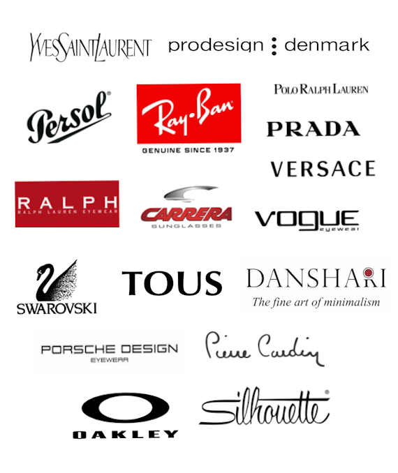 • Agatha Ruiz de La Prada • Arnette • Carrera • Chanel • Dior • Façonable • Georgio Armani • Persol • Pierre Cardin • Polaroid • Polo Ralf Loren • Prada • Prada Sport • Ralf • Ray-Ban • Silhouette • Versace • Vogue • entre outras….